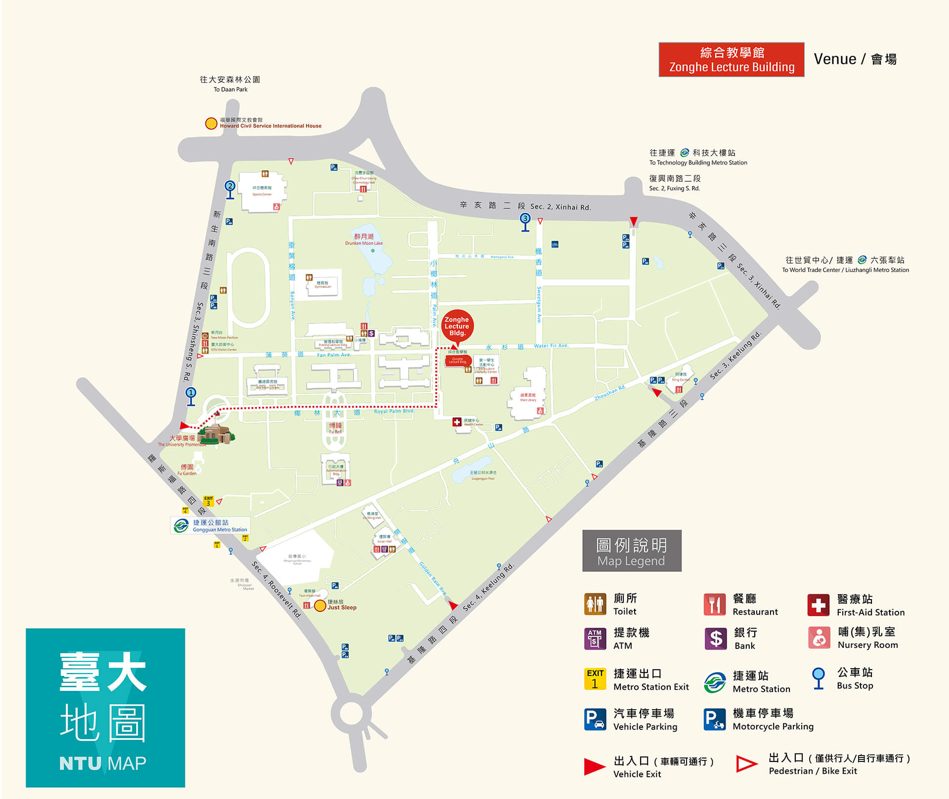 Take Songshan-Xindian Line (Green Line) and take the Exit 3 and walk around 12 minutest to the Multi-Purpose Classroom Building.